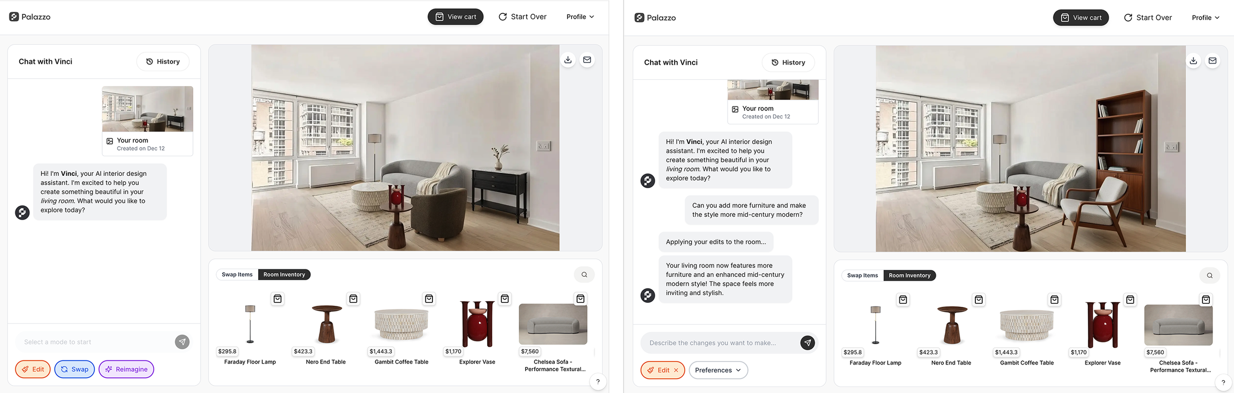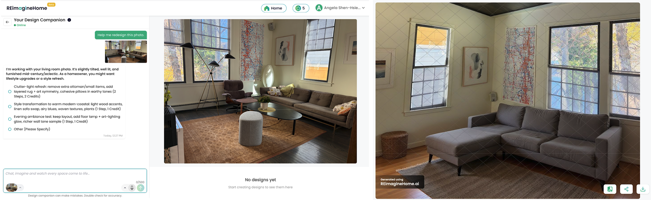 All interaction happens through a chat-like UI. I uploaded a room photo, chose Mid-Century Modern, and got the first image on the left: