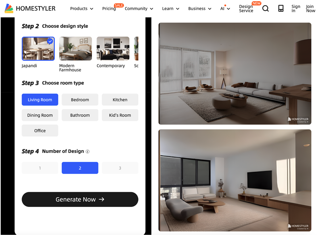 One of the easiest to start: no login, no signup, no credit card. I went straight to the AI styling feature, uploaded a photo, and chose Japandi style: