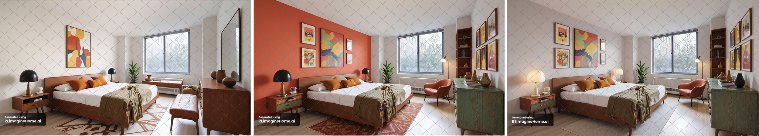 Then I prompted for changes: less formal feel, lounge chair, more eclectic furniture, more decor, and move the bench from in front of the dresser to the foot of the bed (center image with orange wall.)