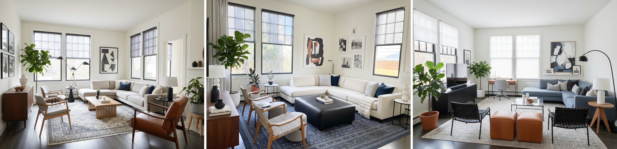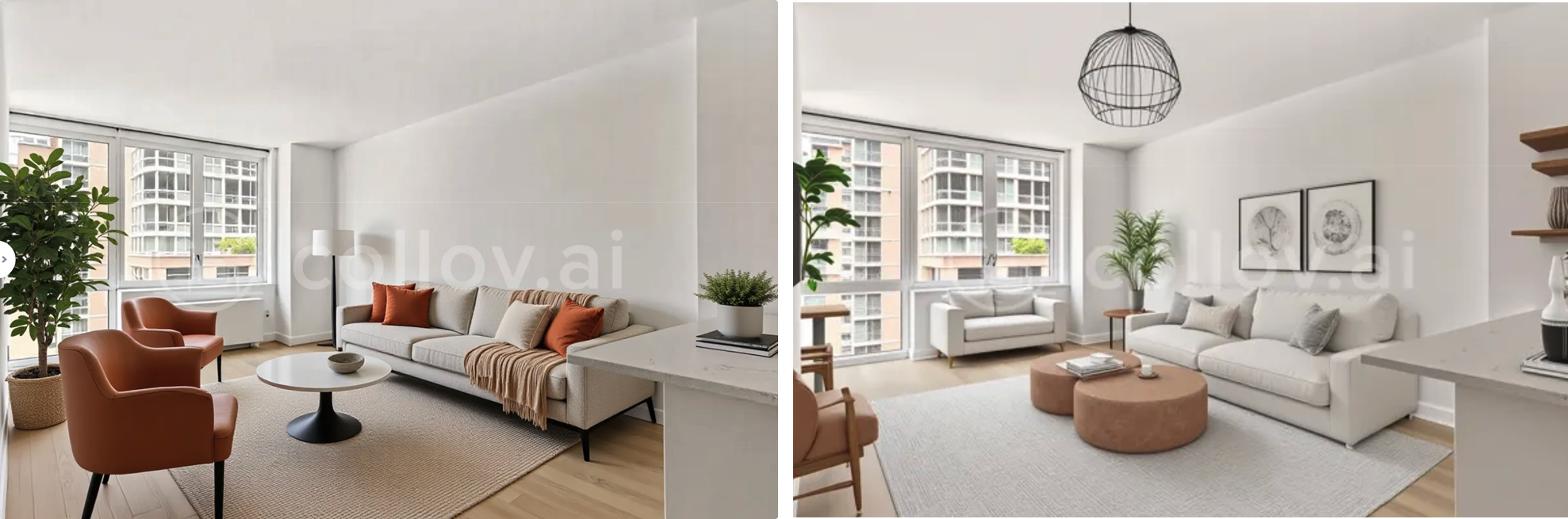 The Collage results had good image quality with decor and artwork filled in somewhat. But the room was completely changed with no seating opposite the coffee table—a common AI issue where algorithms struggle to distribute furniture evenly across spaces.
