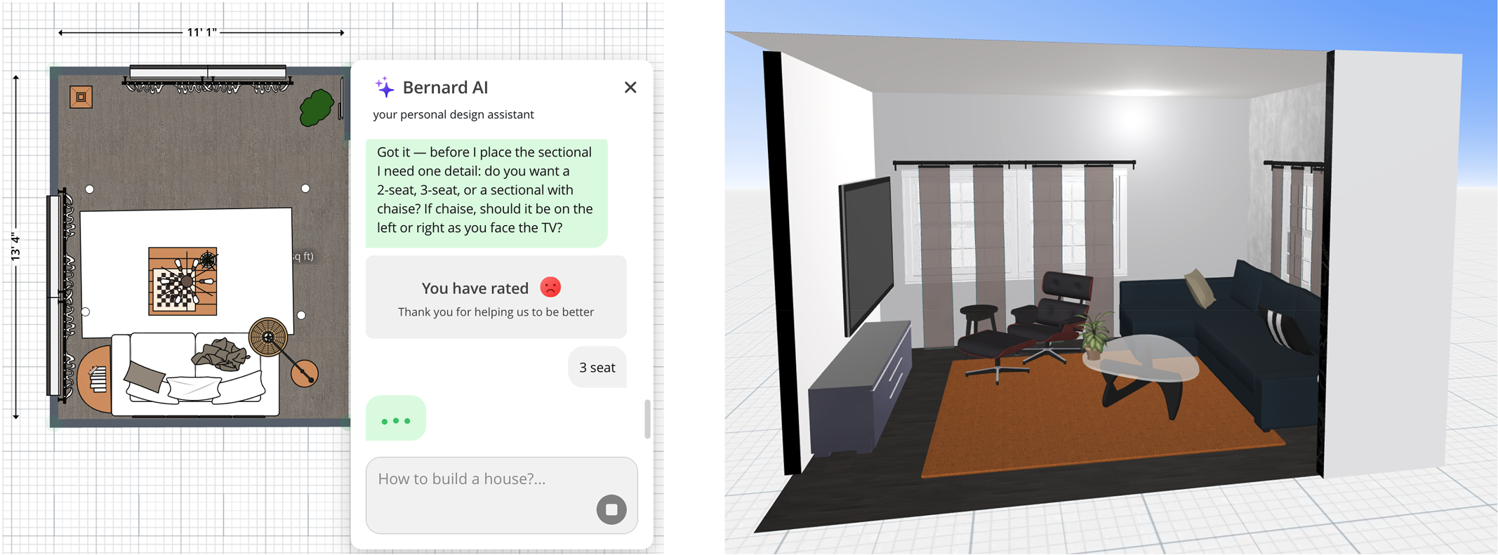 I eventually deleted the AI's furniture, selected a sectional from their library, scaled it manually, and placed it myself. Nice that they had an Eames chair (though I couldn't remove the ottoman). Then I clicked "3D" and got the rendering above on the right.