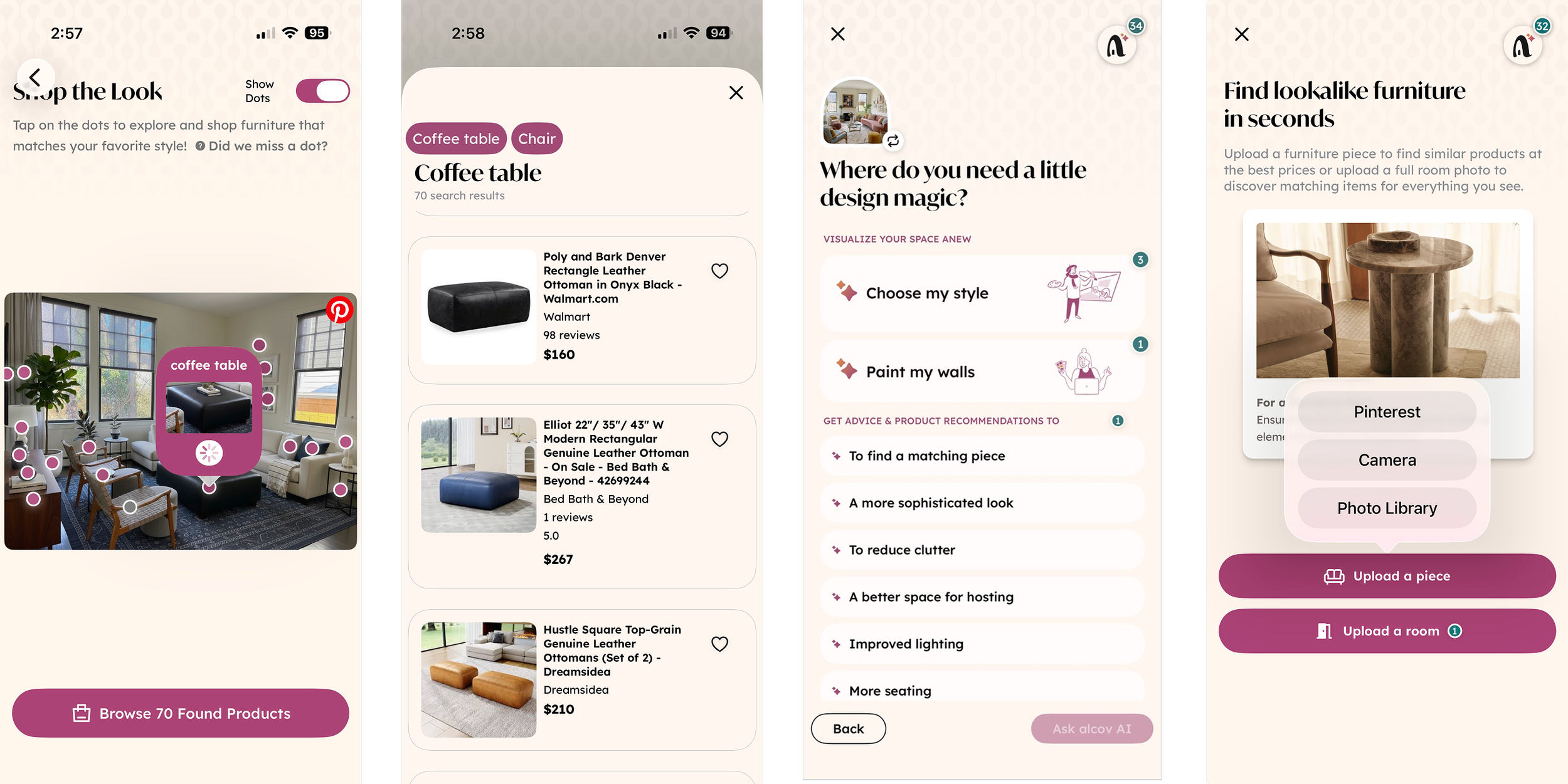The shopping features are integrated so you can shop from an image the AI generates or upload an inspiration photo or choose one from your Pinterest board and it'll find affordable dupes or similar pieces. Already have a sofa you love? Show Alcov a photo and it'll suggest pieces that work with it. The Pinterest integration keeps your style exploration and shopping organized in one place. There's even an advice feature for questions like "how do I get better lighting?"
